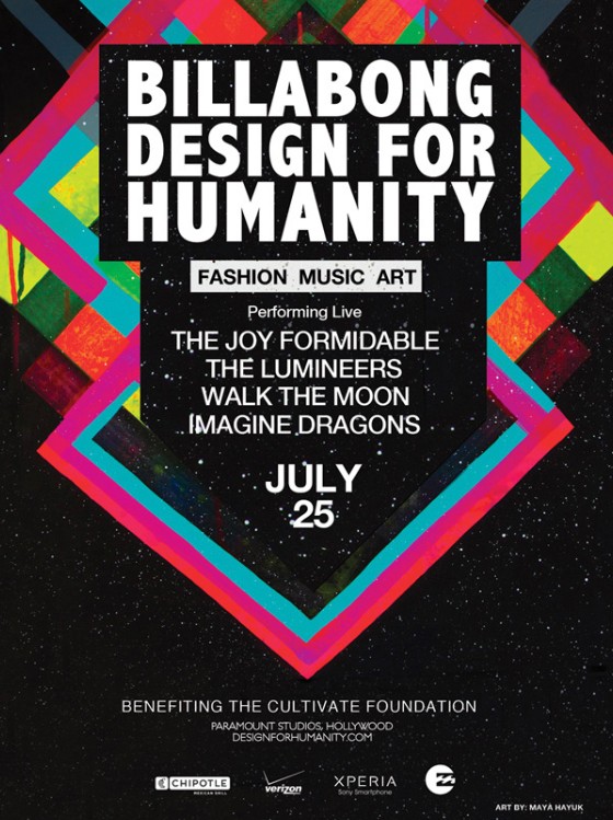 This year’s Design for Humanity will feel like a music festival offering multiple performances on three stages by some of today’s hottest bands and DJs. Indie rock bands Walk the Moon and Imagine Dragons will open the show followed by performances by American folk rock band The Lumineers and headliners Welsh alt rock band The Joy Formidable. . . . Guests will get an exclusive sneak peak of the Billabong Spring 2013 Billabong collection, which will be showcased in a runway show in conjunction with a number of one-of-a-kind custom pieces during the Design for Humanity event.