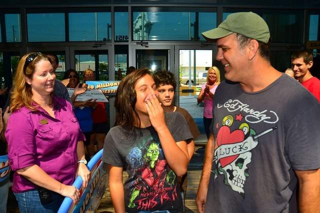 Mark Jensen became the 50 millionth guest at the landmark Cocoa Beach store as he strolled in with Olivia and her brother, 13-year-old Mark Jr. The honor carried with it a surfboard, a $550 in-store shopping spree and a $2,000 check to be used at any other Ron Jon location throughout the United States. . . “This is unbelievable,” Mark Jensen said, posing for photos with his children as he was handed a surfboard-size ceremonial check for $2,000 signed by Ron Jon President Debbie Harvey. . . “We’re in shock. I’ve never won anything like this,” he said.