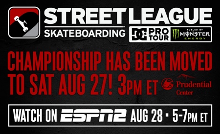In response to Hurricane Irene, please note that the Street League Skateboarding Championship event at the Prudential Center in Newark, NJ that was originally scheduled for this Sunday is being moved one day earlier to tomorrow, Saturday, August 27th at 3pm. Tickets will be honored for the new date and doors for the public will open at 2pm. Refunds for ticket holders who cannot make the new date, will be available at the point of purchase beginning on Monday. The championship broadcast will still air at its original time-slot at 5PM ET on August 28th.