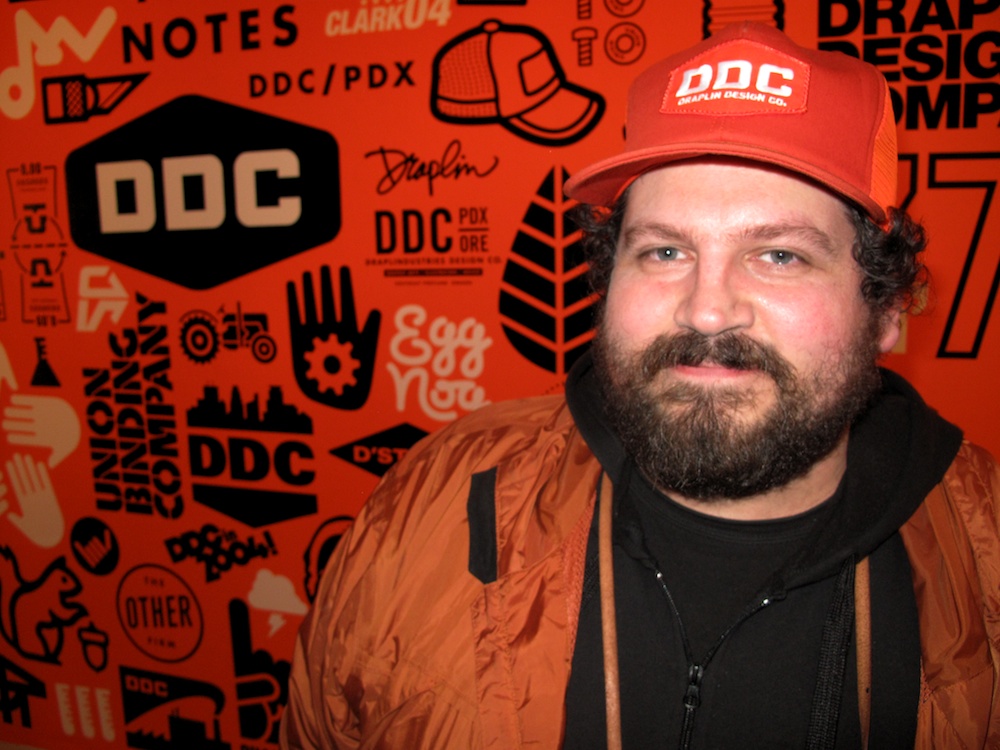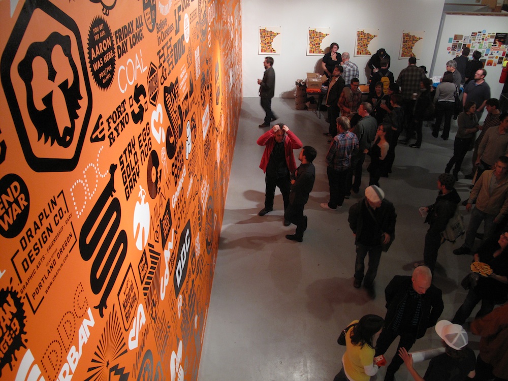 Inside Burlesque of North America’s old warehouse in Minneapolis’ North East side, a QR code on the wall linked mobile phone users to a personal welcome from Aaron regarding the Thanks MLPS show. CO even provided headphones. But all these nice touches paled in comparison to the enormous, orange wall filled with 400 black and white Draplin logos. It’s a reminder of the impact Draplin has made on snowboarding and graphic design in general. Pretty much everything Draplin Design Company has created over the past ten years is on the wall.