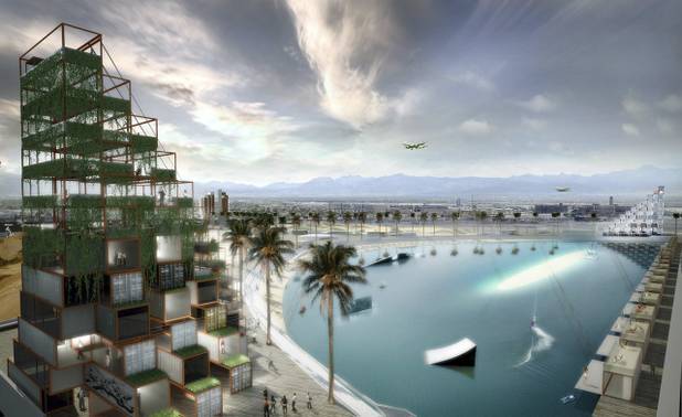 “Vegas Extreme will stand as a new model for amusement parks around the world,” Kearney said. “Its focus is on an exploding generation of sporting events and recreation that push the boundaries of human movement.” . . .The amusement park would include a white sand beach for sunbathing and cabanas fashioned out of repurposed shipping containers. A 7-acre lake would offer jet skiing, whitewater rafting and wakeboarding. A cable system would allow up to 10 riders to zip around the lake at once. . . During winter, the lake could be drained and filled with snow. The resulting “ski bowl” could be used for snowboarding.