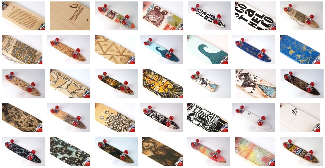 The auction, which began yesterday and continues until October 20, 2009, features what organizers are calling “the original shape of skateboards when they first hit the market” featuring art by skateboarding artist and “those affected by the skateboarding industry.”