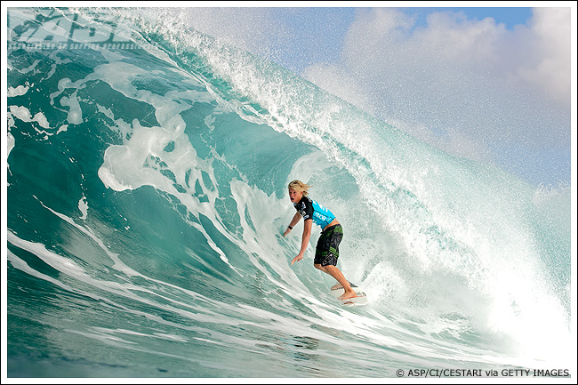 John John Florence (HAW), 16, wildcard and youngest the competitor in the Billabong Pipe Masters, was dominant once again today, effortlessly threading both the Backdoor rights and the Pipeline lefts with pancahe and aplomb to net the day’s highest heat total, an 18.90 out of a possible 20, to eliminate ASP World No. 27, Heitor Alves (BRA), 27.