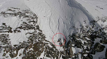 A reckless snowboarder clings to the mountainside inches from certain death on the edge of a cliff. . . He had left the safety of the piste . . . in search of fresh powder. . . After stopping he managed to dig away enough snow so his board wouldn’t slip while he waited for help.