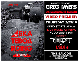 DC Shoes AM, Greg Myers is rolling on GreenIssue wood and they say he’s killing it. Check out his DC Shoes “Skateboarding is Forever” Video part, drink free beer, and rock out with Nihilist and the LDSjs at the Saloon in Encinitas, CA. this Thursday 2/25/10 at 8:00pm.