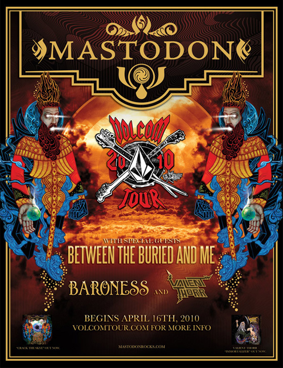 Volcom is proud to announce the spring 2010 U.S. edition of The Volcom Tour, headlined by Mastodon, beginning April 16, 2010 and featuring special guests Between the Buried and Me, Baroness and Valient Thorr.