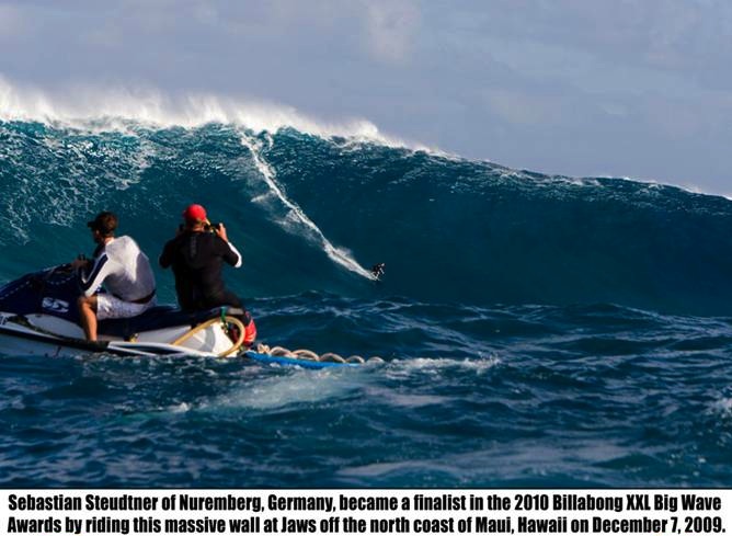 The wildcard in this year’s XXL Biggest Wave proceedings is a surfer named Sebastian Steudtner of Nuremburg, Germany who towed into a clear nomination by charging left on one of the biggest waves of the day on December 7, 2009. Despite four years of Jaws apprenticeship, Steudtner was a virtually unknown quantity in the big wave world until this life-changing ride pushed him to instant celebrity.