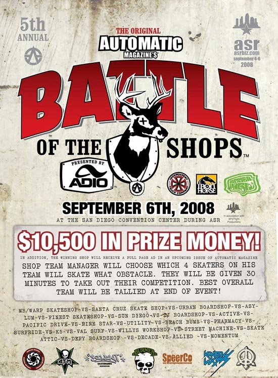 Leave it to a small, local San Diego skate magazine Automatic to come up with something the corporate magazines could never figure out: a skate contest that draws retailers together to see who has the best shop team. It’s Saturday, August 6, 2008 at the ASR Show.