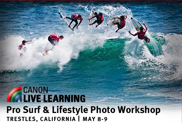 Oddly enough, the last time we were standing on the beach at Trestles we were right next to Bo Bridges. Truthfully, he’s a pretty good guy to stand next to (especially if you can shoulder hop his settings). We blamed his superior images on the size of his lens (600 mm). Now that we’ve seen this Canon Live Learning Pro Surf & Lifestle Photo Workshop flyer we’re not so sure.