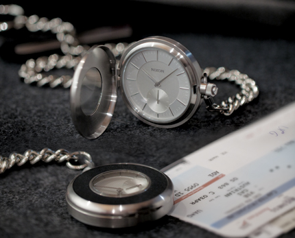 No, no. It’s not what you’re thinking. We’re just trying to check the time with our new Nixon Highball Pocket Watch. Seriously, it’s in here somewhere. . .