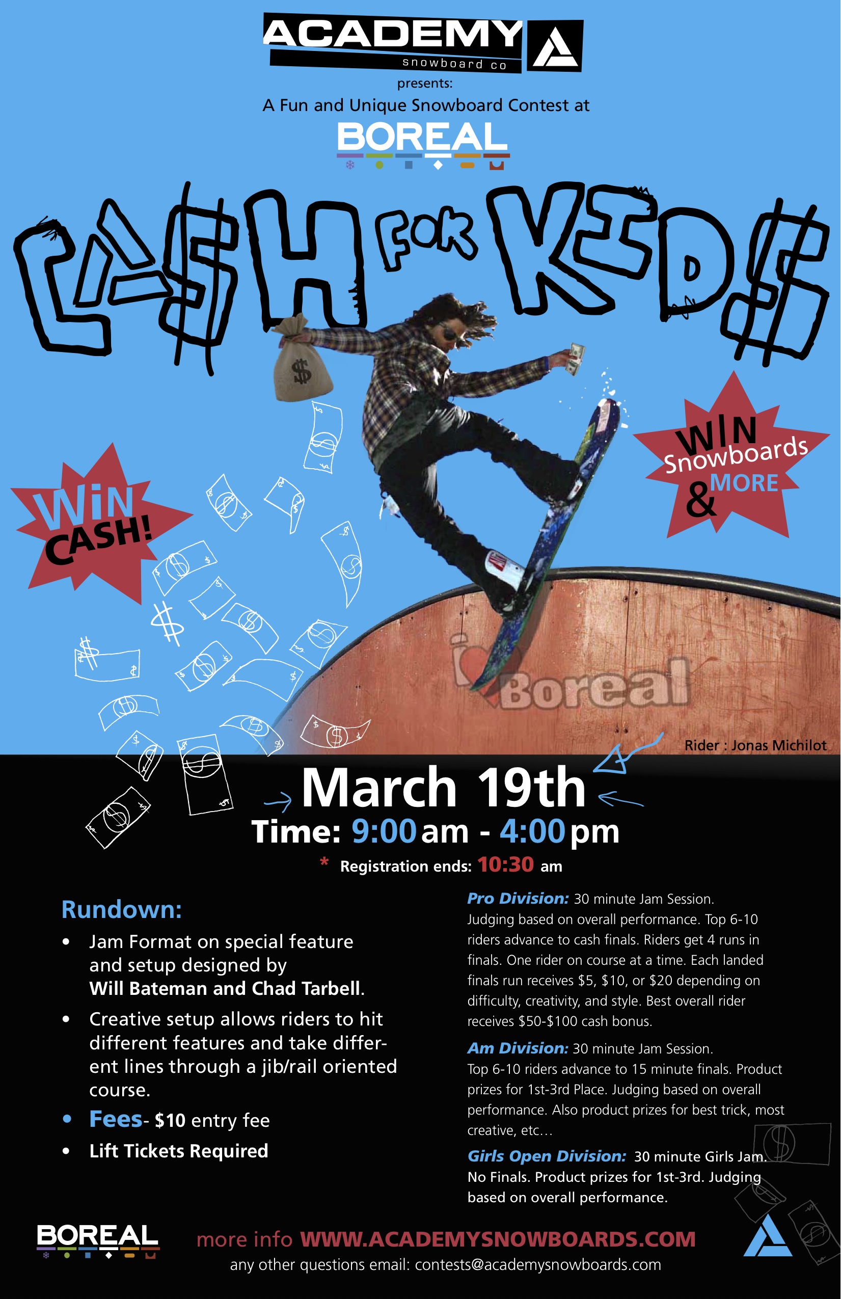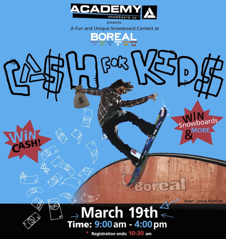 On March 19, 2011 Academy Snowboards at Tahoe’s Boreal Resort will host a Cash For Kids comp on “a jib feature specially designed by Academy Snowboards’ Team Riders Chad Tarbell and Will Bateman.