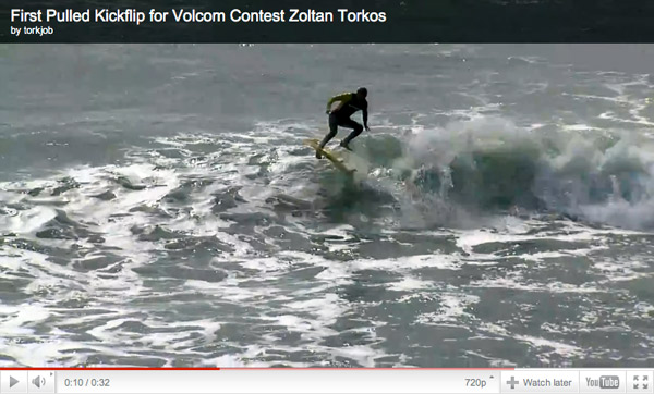 After further review Volcom has decided to reward Zoltan the $10K for his groundbreaking maneuver, and at the same time redefine the rules and double the prize money on the elusive “above and off the lip kickflip” now worth $20,000. . . “We really want to celebrate Zoltan’s successful kickflip, and continue to push the concept of futuristic surfing. Zoltan was the first and we feel shouldn’t be the last,” said Volcom’s Director of Surfing, Mike Guarino.
