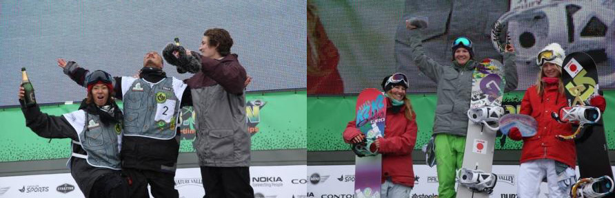 The day kicked off with the women’s halfpipe finals where hometown hero Kelly Clark (USA) stole the show in one of the most exciting women’s finals of the season. All the girls came out swinging from their first run, but Kelly took a healthy lead from the beginning with a score of 91.05. Fellow Vermonter and Olympic gold medalist Hannah Teter tried to catch Kelly and went big and technical in her second run, starting out with a huge method followed by a frontside 900 stalefish, a backside 540 melon grab and a frontside 720 stalefish. But Kelly kept topping her own scores, earning the best result with her victory lap. Kelly’s highest scoring run started out with a huge 900 indy grab, a backside 540 mute grab and the only stomped 1080 in the women’s finals. Kelly has had one of the best seasons in the history of snowboarding, and her win today made this her eighth consecutive victory for the season.