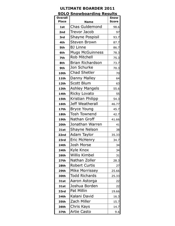 Two-time Ultimate Boarder® Champion Chad Shetler took tenth place in the snow today, leaving him in prime position to three-peat as the UB Champ. Veteran UB competitor Shayne Pospisil who finished is 3rd is also a contender for the top spot.