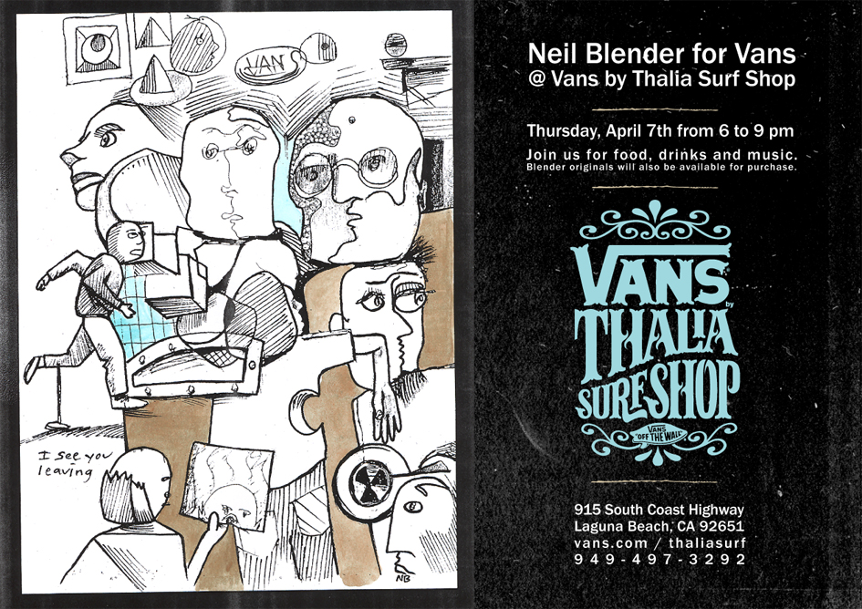 The Neil Blender for Vans show opens tonight (April 7, 2011) at 6 PM. The Vans Thalia Surf Shop is located at 915 South Coast Highway, in Laguna Beach, California.