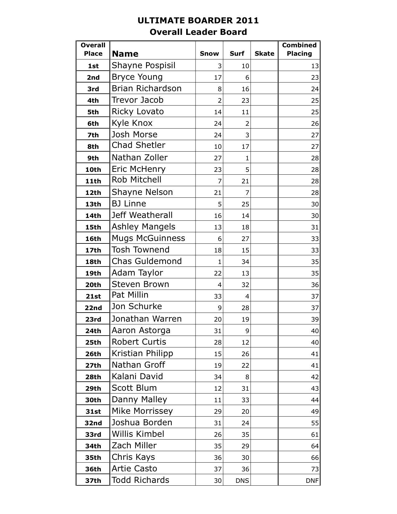 Surfer Nathan Zoller won the solo surf event, but his 27th place in snow relegated him to 9th place over all. With a 10th place finish snowboarder Shayne Pospisil cemented his lead in the overall competition. Go snow!