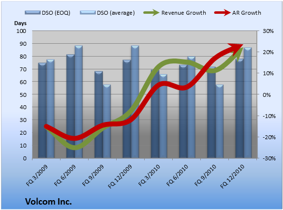 The Motley Fool’s Seth Jayson takes a look at Volcom stock today in a story titled, Is Volcom Going To Burn You? In it he looks specifically at Accounts Receivables and Days Sales Outstanding (DSO) to attempt to see the future of the company.
