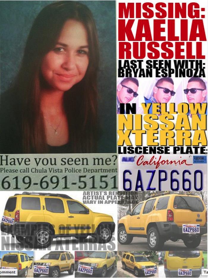 Last night the pleas went out over Facebook, Instagram, and via text: Skateboarder Kanten Russell’s 15-year-old daughter Kaelia has been reported missing in Chula Vista, California. She was reportedly last seen with a Bryan Espinoza in a yellow Nissan Xterra with license number 6AZP660.
