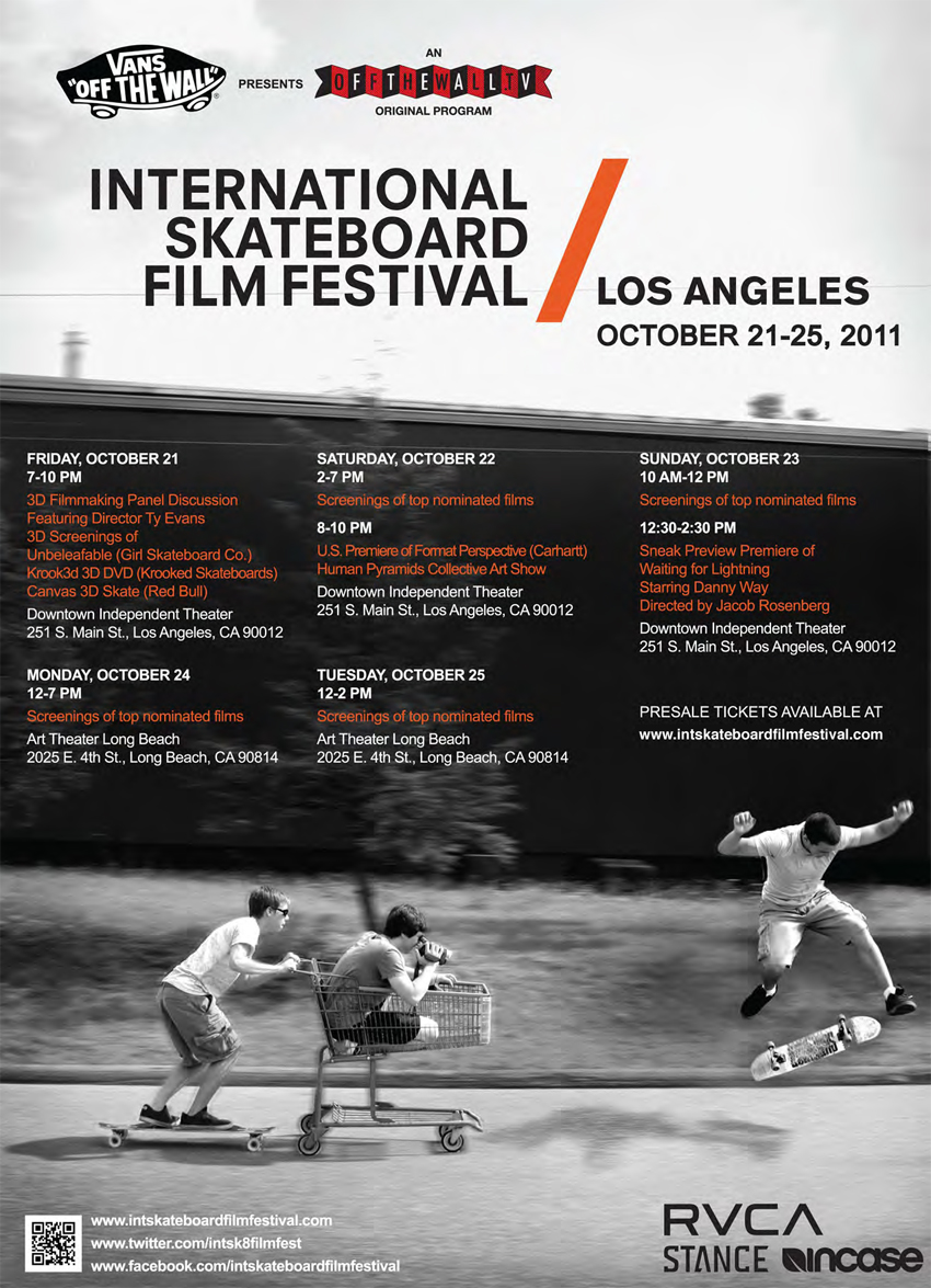 The four day International Skateboard Film Festival presented by Vans kicks off tonight (October 21, 2011) at Los Angeles California’s Downtown Independent Theater with a 3D Filmmaking Panel Discussion featuring director Ty Evans with screenings of Girl Skateboards’ Unbeleafable, Krooked’s Kook3d 3D DVD, and Red Bull’s Canvas 3D Skate.