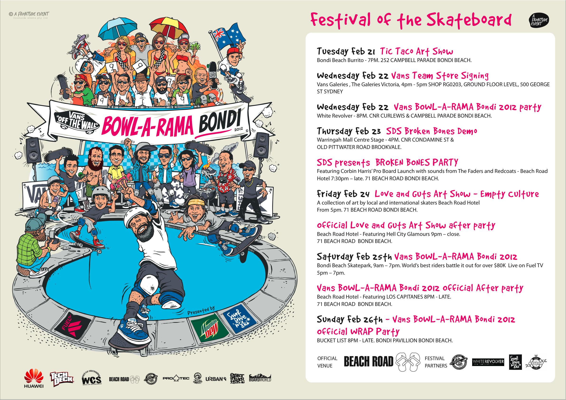 Tomorrow (or actually today in Australia Tuesday, February 21, 2012) the week of skateboarding madness known as The Festival of the Skateboard begins at Bondi Beach with the Tic Taco Art Show and once it gets rolling there is no slowing down until the official Bowl-A-Rama wrap party on Sunday night.