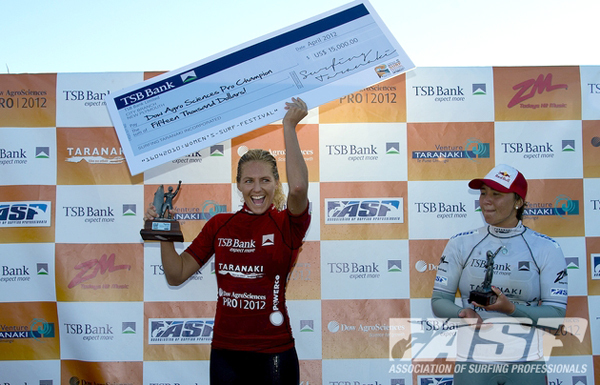 Follow the jump for the official word from the ASP.TARANAKI, New Zealand (Saturday, April 14, 2012) – Stephanie Gilmore (AUS), 24, has won the TSB Bank NZ Surf Festival’s blue ribbon event, the Dow AgroSciences Pro in clean three foot (1.5 meters) surf over Carissa Moore (HAW), 19, at Taranaki, New Zealand today.