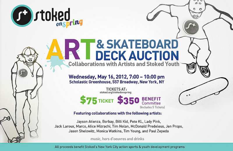On Wednesday, May 16. 2012 Stoked Mentoring is hosting their Stoked on Spring Art & Skateboard Deck Auction: Collaborations with Artists and Stoked Youth. The event features artwork by: