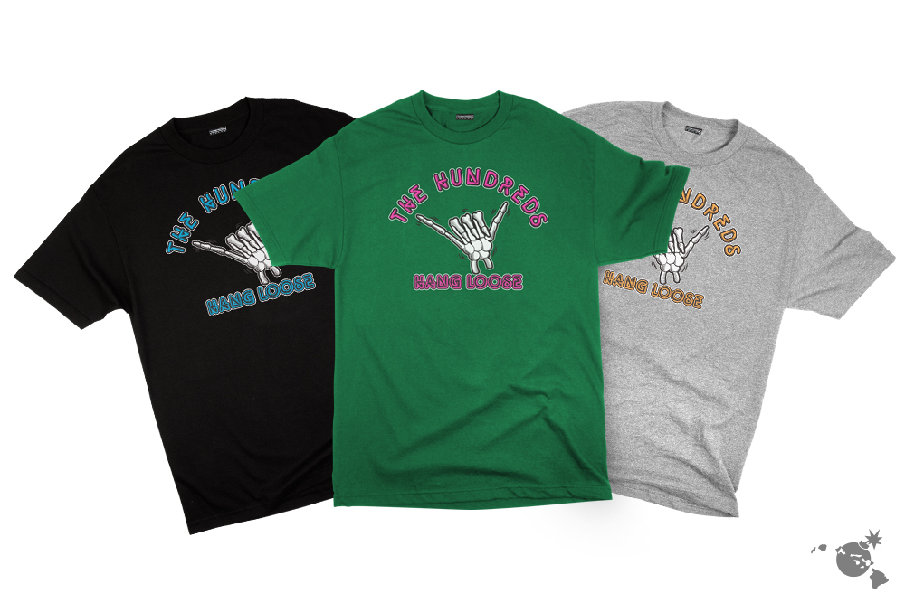 Hang loose! That saying basically originated on the islands of Hawaii, meaning “relax” and “kick back,” more or less. The Loose tee features a skeleton hand graphic in the shape of the “hang loose” hand sign, with The Hundreds logo at the top. Solid Bomb logo at top back.