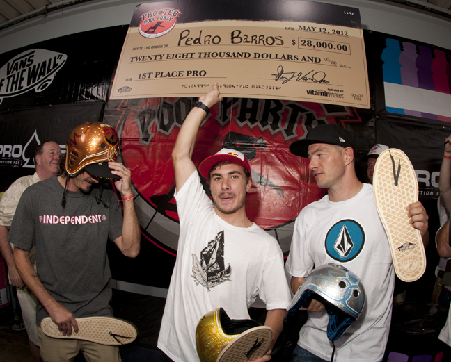 Vans Skatepark, Orange, CA (May 12, 2012) – Seventeen-year-old Brazilian Pedro Barros defended his first Pro-tec Pool Party Pro crown to win $28,000 at the Vans Skatepark in Orange, California Saturday night as he again fought off Rune Glifberg in second place and Bucky Lasek who returned to the Pro-tec podium after missing last year with a broken wrist.