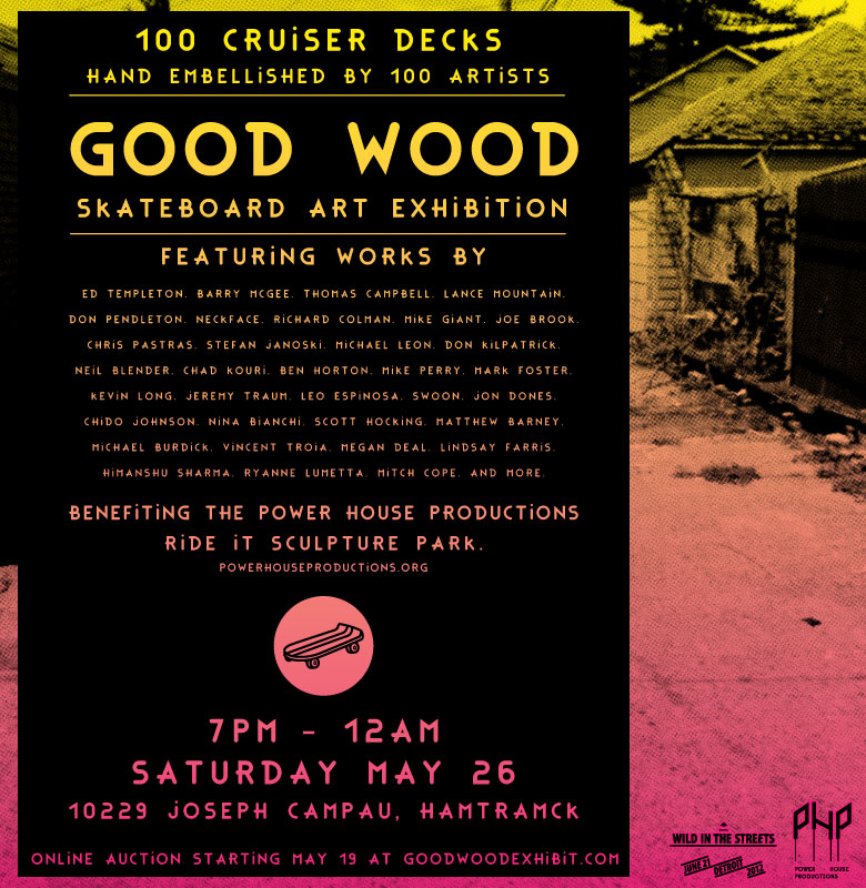 The Good Wood Exhibit, a fundraising art auction which will close in Detroit, Michigan on May 26, 2012, features 100 skateboards created by a who’s who of artists from the skateboarding world and the contemporary art scenes in Detroit and beyond. 100% of the Good Wood proceeds go directly to fund building of a do-it-yourself style skateboard park in Detroit named RideIt Sculpture Park. Emerica’s Wild in the Streets will be held June 21, in Detroit, also benefiting RideIt Sculpture Park.