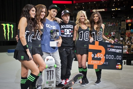 Seems a winter off hasn’t slowed Nyjah Huston down one bit if the first stop of the 2012 Street League Skateboarding event in Kansas City is any judge. After blazing his way through the finals he rolled away with $150,000 for the win and another $10,000 for best trick. Here’s how he did it: