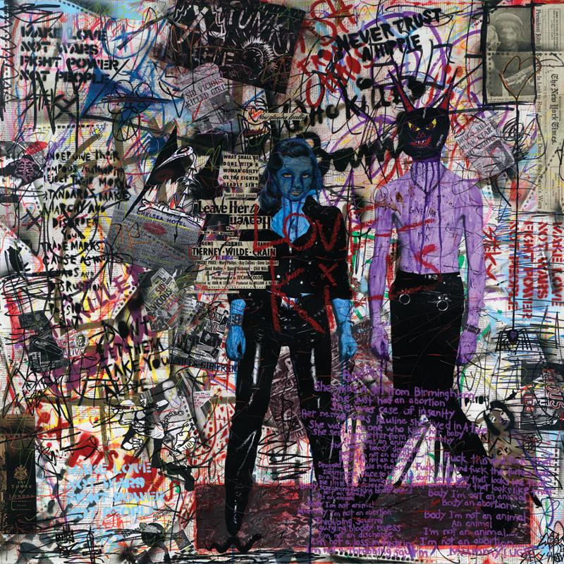 AR4T Gallery is pleased to present Love Kills, the first solo exhibition by Orange County artist Robert “Sticky” Shaw. Sticky is known for his bold characters taking claim over a complex backdrop of manic lines and collected paper mementos – each small piece an individual memory carefully placed to create a multiple-layered landscape through which we walk. A plethora of 1930s-60s newspaper clips saved by his father, love notes, lipstick and music bills become a waking dream of creative drama.