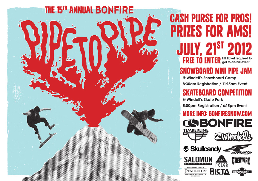Bonfire, Timberline, and Windells will be hosting their 15th Annual Pipe To Pipe snow/skate competition at Mt. Hood on July 21, 2012. Take this is fair waring then click the line for more details.