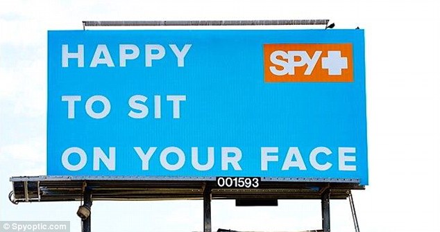 The signage was meant to be a tongue in cheek promotion of SPY Optic’s new line of ‘Happy’ lenses, which purportedly lift one’s spirits with their special design. . . ‘We are a happy brand,’ Spy Marketing Director Devon Howard said to MailOnline. ‘It’s what makes us happy-being on people’s faces.’ . . Thousands of San Diego drivers sped past the sign yesterday, the only day it was displayed, and it appears their complaints swayed the owner of the advertising space to quickly rip it out of sight – but not out of mind.