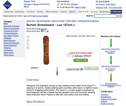 Looking for a last minute gift item for the snowboarder in your life? Sam’s Club has a great selection of Burton Snowboards. The prices aren’t that great but they’ll ship them right to you and they are covered by Sam’s Club Member Satisfaction Guarantee. How rad is that?