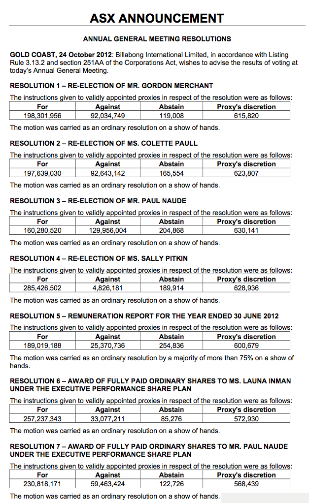 At Billabong’s Annual General Meeting today (October 24, 2012 on the Gold Coast) Merchant was re-elected to the board by a vote of 198 million for to 92 million against. Collette Paull was re-elected by a vote of 197 million for to 92 million against. The closest board re-election race was Billabong US President Paul Naude. He slipped back onto the board with 160 million for and 129 million against suggesting that more than a few shareholders are not happy with his performance on the board.