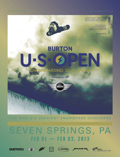 BURLINGTON, Vt. (November 20, 2012) Burton Snowboards is excited to announce that as a part of the next chapter of the 2013 Burton US Open, the qualifying rounds will become a stand-alone, East Coast event called the Burton US Open Snowboarding Qualifiers presented by MINI. Created in association with long-time partner U.S. Snowboarding, the new US Open Qualifiers will take place during a U.S. Revolution Tour stop from February 1-3, 2013 at Seven Springs Mountain Resort in Pennsylvania, a resort that has a long heritage of supporting and progressing snowboarding.