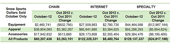 Comparing only the month of October 2012 to October 2011 (rather than the period Aug – Oct), snow sports retail sales declined 5% in units and 4% in dollars sold – about $13M less in October 2012 compared to October 2011 for all apparel, accessories and equipment retail sales. Apparel sales increased slightly (1%) reaching $161M and accessories sales including goggles, gloves, wax, hats and cameras fell 4%. October 2012 was a very difficult month to sell equipment; snowboard equipment sales declined 19%, cross country equipment sales fell 30%, and alpine equipment sales were off $4M or 8% for the month of October.