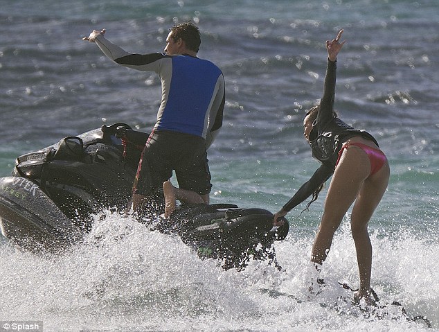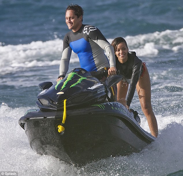 The Diamonds In The Sky star showed off her bikini body as she indulged in her favourite pastime, jet-skiing, with pro surfer Makua Rothman. . .The pop star was seen holding onto the back of a jet-ski as Rothman sped around the Hawaiian waters. . . Wearing a rash vest, orange and pink bikini bottoms, and a life vest, Rihanna beamed as she went on the wild ride.
