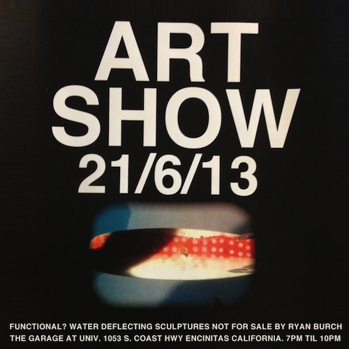 Ryan Burch will be showing a collection of his surfboard shapes tomorrow (Friday, June 21, 2013) in The Garage at UNIV in Encinitas, California. The show, titled Functional? Water Deflecting Sculpture Not For Sale, will highlight the innovative shapes that Burch will spend the next year surfing.