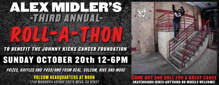 Alex Midler will be hosting his 3rd Annual Roll-A-Thon to benefit the Johnny Kicks Cancer Foundation at Volcom Headquarters in Costa Mesa, California on Sunday, October 20, 2013. The foundation’s mission is to “cure childhood leukemia through awareness and funding for cutting-edge research, as well as to empower and encourage patients, families and doctors in their fight against the number one childhood cancer.”