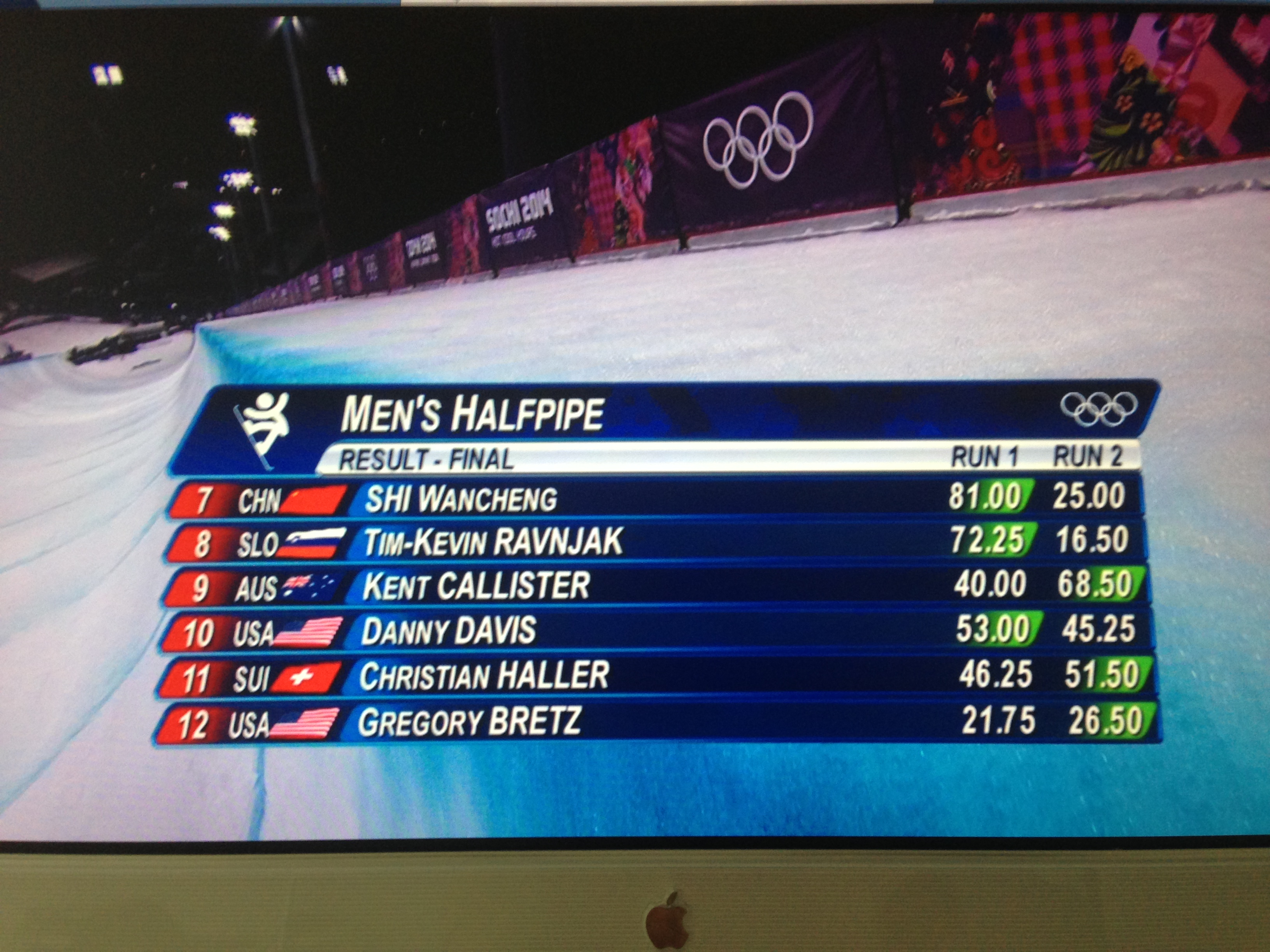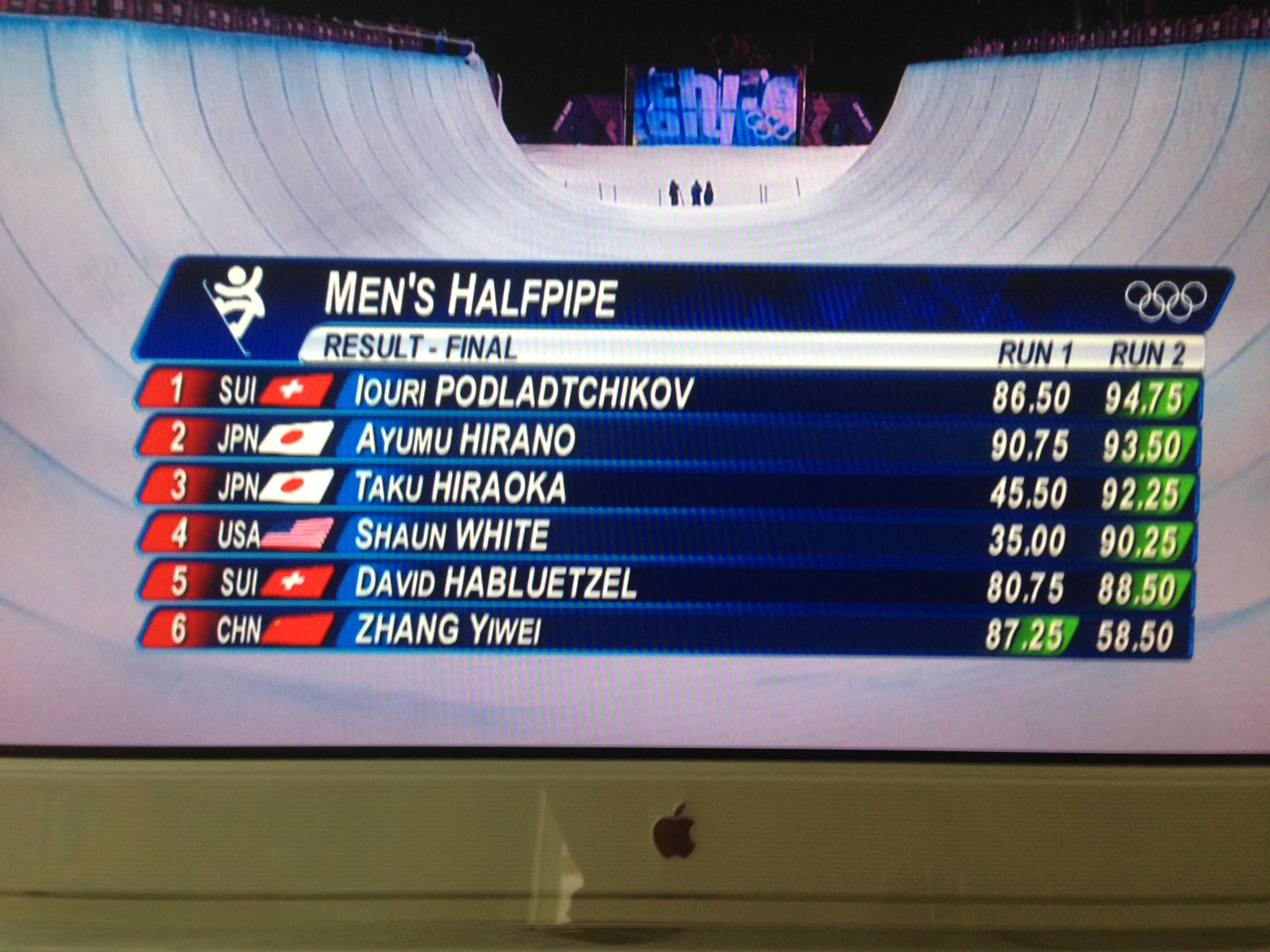 The pipe at Sochi’s Rosa Khutor Extreme Park was reportedly terrible, possibly the worst Olympic Halfpipe since the debut of snowboarding in the 1998 Nagano Olympics. But 12 snowboarders soldiered on through the sugar and sand flats, over holes in the walls, and three of them prevailed on Tuesday night, February 11, 2014. Sadly for US fans it wasn’t the American dream team let by two-time Gold Medalist Shaun White. It was the Swiss and Japanese.