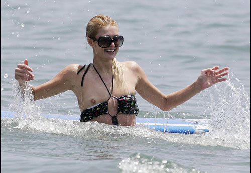 Since Paris Hilton got out of jail it seems like she’s living the wild life by spending time in the water learning to surf. Surfermag.com’s Scott Bass questioned people about what they think of Paris becoming a surfer girl. As usual, the guys don’t mind and girls think she’s going to ruin the sport. Us, we don’t think it’s a problem at all. . . especially if she keeps having wardrobe misshaps.