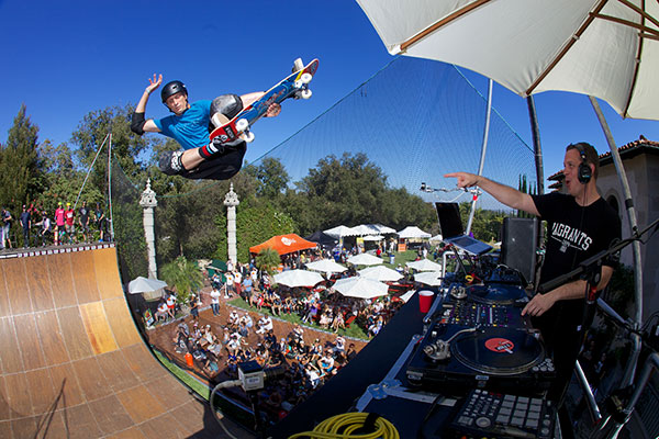 Attendees included: pro-skaters Lizzie Armanto, Andy Macdonald, Allysha Bergado, Tom Schaar, Elliot Sloan, Kevin Staab, and Lincoln Ueda along with celebrities like Mel B., Erik Estrada, Eve, Perry Farrell, Brian Austin Green, Tom Green, David Hasselhoff, Anthony Keidis, Chuck Liddell, Joaquin Phoenix, Rain Phoenix, Slash, Verne Troyer, Robert Trujillo, Chris Tucker, Lars Ulrich, and Wee Man. It was a fun filled day in Beverly Hills for a good cause. For the official word from the Tony Hawk Foundation, please follow the jump.September 23, 2014 (Los Angeles, CA) — With DJ Z-Trip spinning and mashing sounds atop the 13-foot halfpipe, Tony Hawk’s 11th annual Stand Up For Skateparks benefit came to a climactic conclusion with Hawk and other top skate and BMX pros performing an all-star demo yesterday at Green Acres Estate in Beverly Hills, California. The event has become a staple for Tony Hawk Foundation supporters and celebrities alike, offering a fun kid-centric day that culminates with Hawk and friends performing on his personal ramp. And eleven years on, Hawk is still finding ways to mash up the program—this year putting Z-Trip in the middle of the action and high above the crowd.