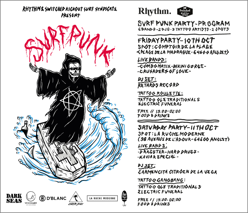 Hey kids, ready to make party in Anglet, France October 10 – 12, 2014? Then the SVRF PVNK MINI FEST is likely what you’re looking for. It’s got: one surf spot, six live rock garage bands, two DJs, a tattoo gang bang, two night spots, Satan, and it’s all free thanks to Rhythm. Follow the link for all the details.