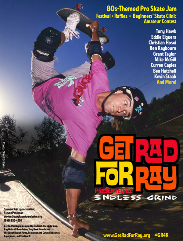 Raleigh, North Carolina’s Marsh Creek Skatepark will be host to Get Rad For Ray Presented by Endless Grind and 80s themed charity event to celebrate the life and legacy of one of skateboarding’s all-time greats, Ray Underhill on October 18, 2014 (Ray’s birthday) and to raise money for the Ray Underhill Foundation’s efforts to assist family affected by Chordoma.
