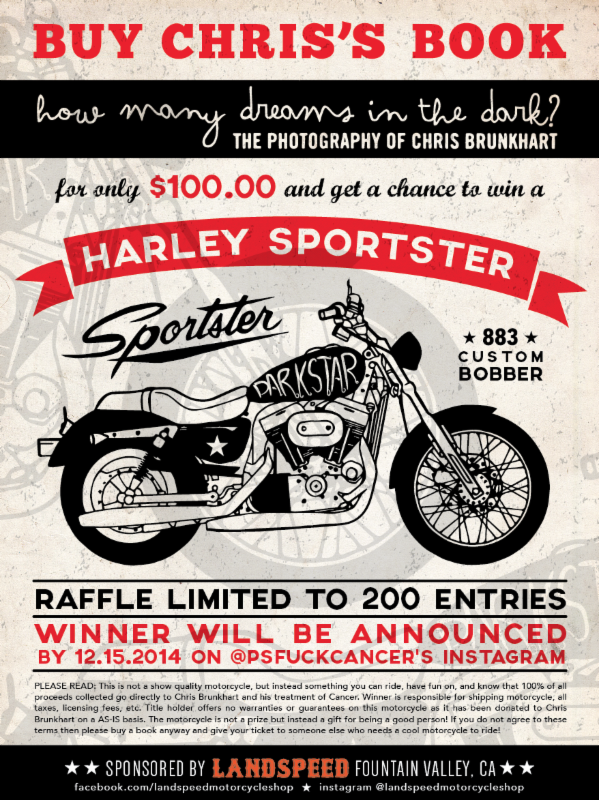 One of the ways you can help is by purchasing Chris’ 2010 book of iconic snow photography, How Many Dreams in the Dark. Up until December 15th, when you purchase the book for $100 you are given a FREE raffle entry to win a custom Harley Sportster that Landspeed Motorcycle Shop is generously rebuilding. Parts have been generously donated by Otto at Biltwell, @SpeedKingSteve and Vintage Speed Garage.