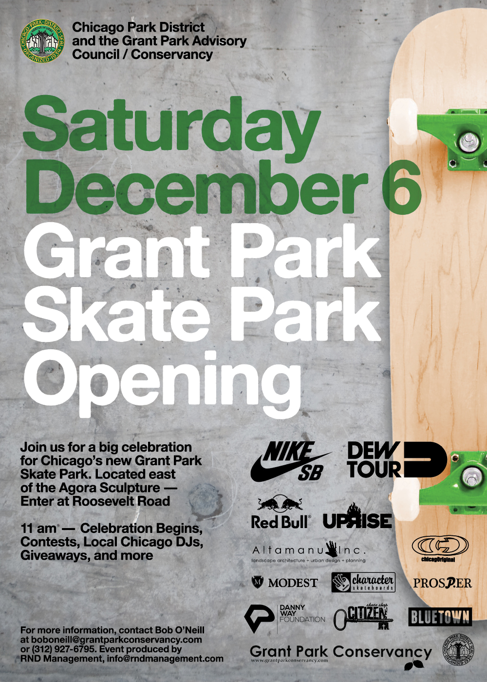 Tomorrow, (Saturday December 6, 2014) Chicago’s Grant Park Skate Park will be hosting a grand opening beginning at 11 AM. There will be contests, giveaways, local DJs and much much more.