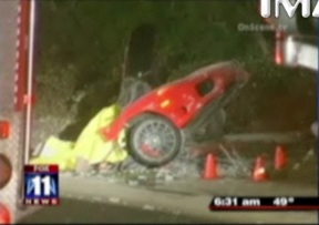 “Mask” was declared dead at the scene. A female passenger — who was ejected from the crash — was taken to a local hospital, but we’re told she’s in bad shape. . . Cops believe “Mask” was racing a guy in a Porsche at the time of the crash, and authorities have since arrested the guy they believe was driving the other car. That man — Jeffrey David Kirby — is being held on suspicion of gross vehicular manslaughter.