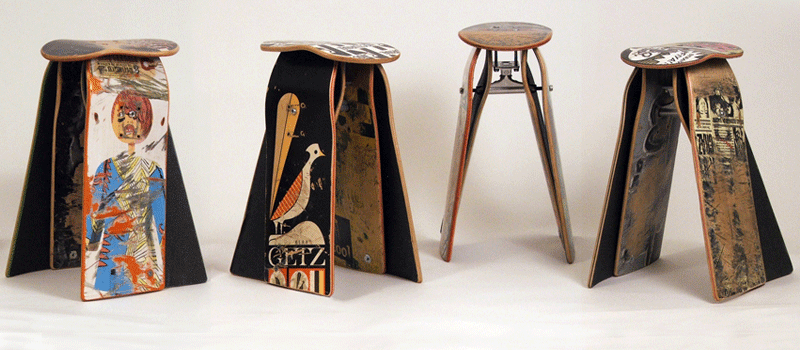 Adam said, “I approached Jay, and I was like, can you make me some furniture out of these things?” So Jason created the Deck Stool. “The design was really based on the way skateboards break,” said Jason. “A large percentage breaks at the truck, because they’re weakened by the holes that are drilled there for the truck. And then the rest break in the center. As you can see by the design, the longer ones become the legs, and the shorter pieces become the seats.”