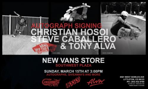 There was a day when we would have let nothing stand between us and a Christian Hosoi, Steve Caballero & Tony Alva autograph signing in Littleton, Colorado. Sadly, that day was about 20 years ago or we’d be there this Sunday March 15, 2009.